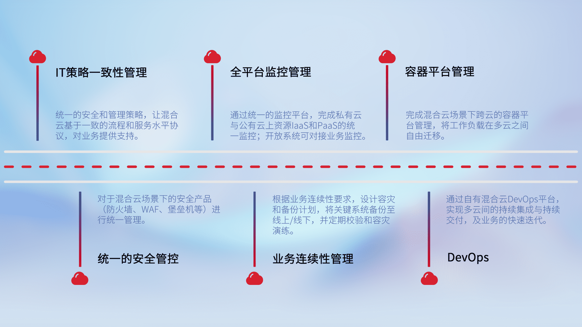 通过多云纳管,,,以统一的资源数据模型把客户的云资源进行抽象和封装,,,进而实现对多云资源的统一操作,,保障云资源管理的可靠性、、、稳定性与可用性。。量身定制化运维内容,,配置、、、开发运维、、、补丁管理、、备份、、、监控、、认证和访问管理、、、、审计和日常巡检等,,,,保障在用云过程中的可靠度,,,稳定度以及高可用率。。。